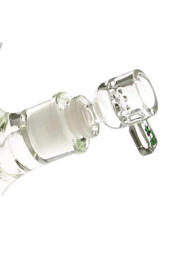 This prominent 18-inch tall Nice Glass beaker bong is at a hefty 9mm thickness. It is moulded to perfection — a process of eliminating any flaws and maintaining consistency in thickness throughout the glass. A straight-forward beaker design with a honeycomb herb bowl and slitted downstem. This is one of our bigger and heavier pieces that is made to last and is very popular with fans.