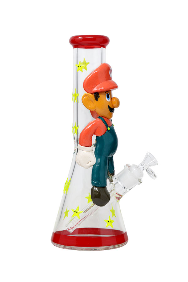 It’s-A Me Mario! Add a little fun piece to your collection with this Nice Glass character beaker bong. The stars and overall buttons will brighten up your night sesh. It comes with a single-hole herb bowl and a horizontal-slit down stem with an open end.