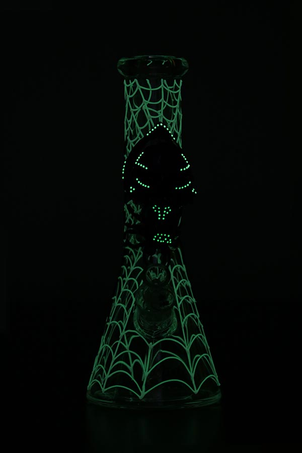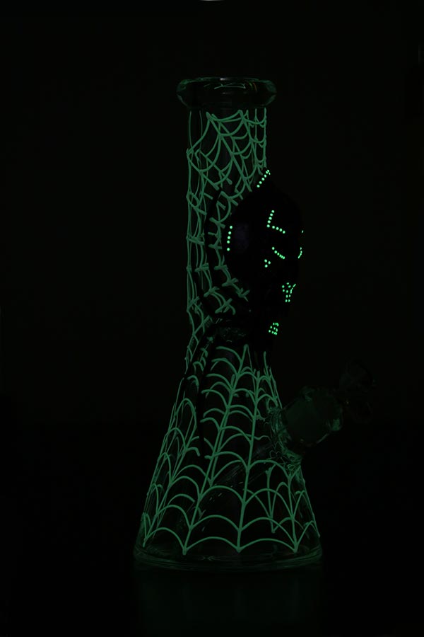This thick beaker is wrapped in a bright purple web that accentuates its classic shape. It is a glow-in-the-dark waterpipe for a real lit experience. It is mainly clear throughout, allowing view of the filtration and vapor. It comes with a herb bowl, down stem, and ice notches.