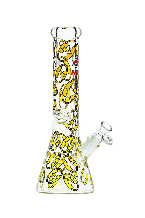 This Nice Glass Bat Man logo beaker comes equipped with ice notches, herb bowl, and slitted downstem. Our character bongs are available in different decal styles, you will sure to find one that calls out to you. They are colourful and full of whimsical fun. Check the others in our line-up.