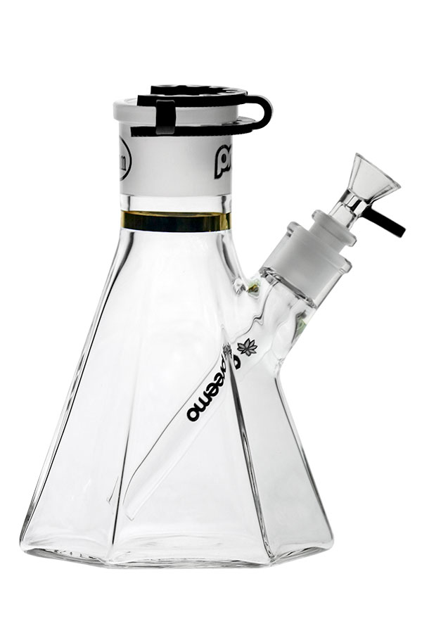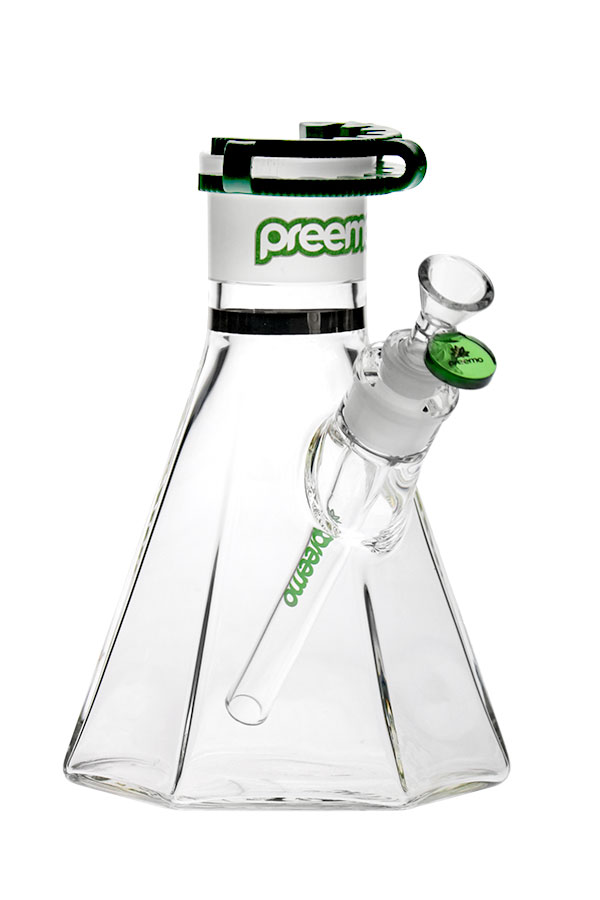 Preemo DIY hexagon beaker base with an open-ended down stem. This water pipe is a nice 7mm thick glass with clean geometric lines. It's a variation of the classic beaker that will pimp up your build in style.