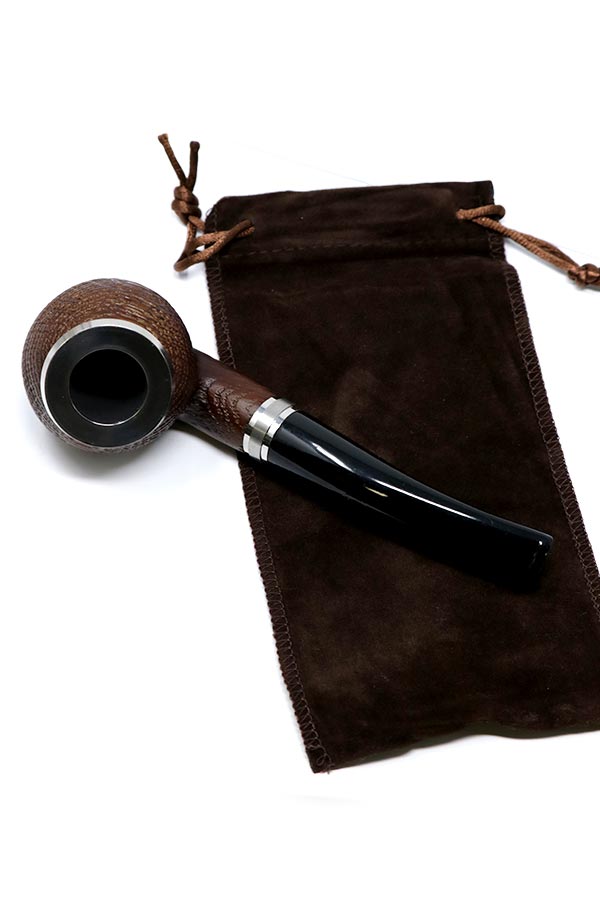 A Dublin-style wooden tobacco pipe with a sandblast finish that enhances the beauty of the wood grain. It has a metal rim and a matching metal band. The joint is a mortise and tenon fit with an activated carbon filter included.