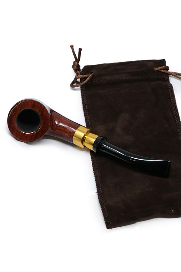A Dublin-style wooden tobacco pipe with a smooth black finish. It has a metal band wrapping the mortise and tenon connection. An activated carbon filter is included.