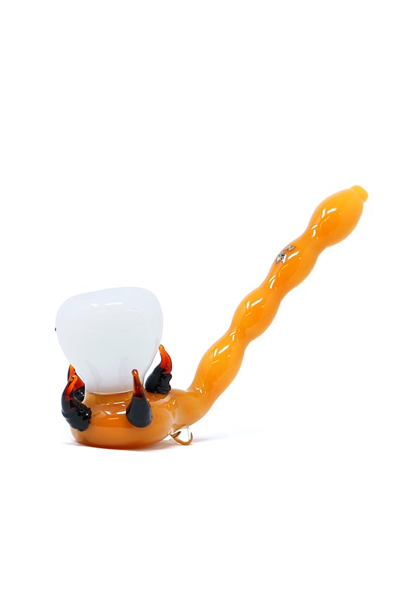 An all glass scorpion inspired design featuring double chambers with the top resembling an eyeball. it has a deep bowl for flowers and single carb hole and two marbles as roll stoppers. This stylized handpipe has colour glass details especially the four protruding horns framing the centrepiece. Available in a range of colour options.