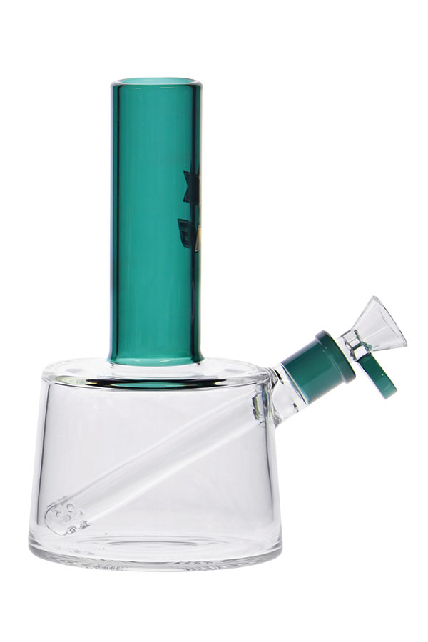 This is a fixed-stem bubbler with a full volume base. The long downstem has a set of diffusion openings and it comes with a flower bowl. The straight tube ends in a mouth opening with no lip, displaying a sleek and modern style. Very similar to a classic beaker style but with a minimalist approach.