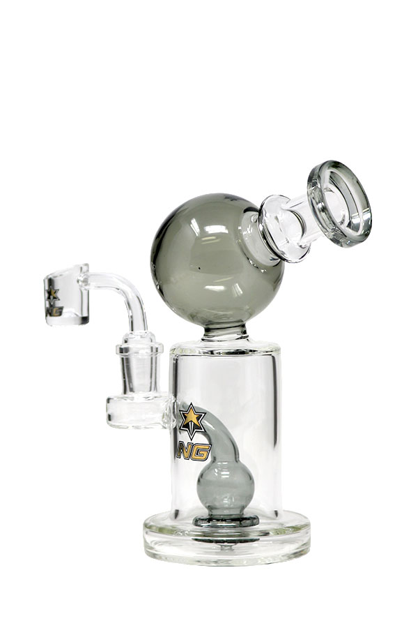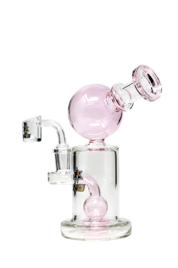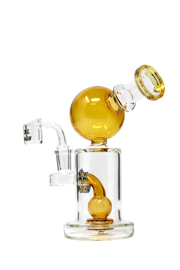 A brilliant showerhead rig that includes a quartz banger. The orb is an added cooling space that also redirects any water from exiting the mouthpiece. It stands at 6.5 inches tall on a sturdy hollow base. The percolator is reinforced to sit firmly on the glass.
